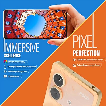 Special features: IP54 Protection, Corning Gorilla Glass 5 protection, 108MP 3X in-sensor zoom AI dual Camera (Photo, Portrait, Night, Pro Mode, Document Mode, Short Video, Panorama, AI Watermark, Google Lens, Voice Shutter, Beautify, Film Filters, HDR Mode, Slow Motion, Timelapse, Movie Frame), Side Fingerprint Sensor, 3.5mm Jack, IR Blaster, 200% Super Volume